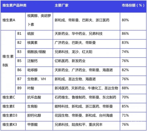 維生素市場需求相對穩定、應用較為普遍、規模較大的傳統藥品原料藥。一般而言,各廠商的生產工藝、技術水平差別并不明顯,生產成本控制是企業競爭的主要手段。由于毛利率高達40%-70%,企業進入行業廝殺的意愿自然是有的,事實上,各品類維生素均經歷過非常激烈的市場競爭,實力較弱的企業已經在歷史的殺戮中逐步退出,最后只留下集中度高的幾大頭部企業,它們占據大部分的市場份額。