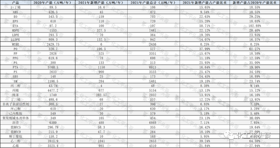 其二,2019年底的浙江石化和2020年初的恒力石化煉化一體化項目投產,以及2020年中旬的寶來石化投產,帶來了眾多煉化一體化產業鏈的產品供給。而由此同時,很多計劃在此時投產的化工項目,也會選擇規避規模化項目集中帶來的影響,不得不對投產時間進行延期,從而造成了2021年集中投產的情況。