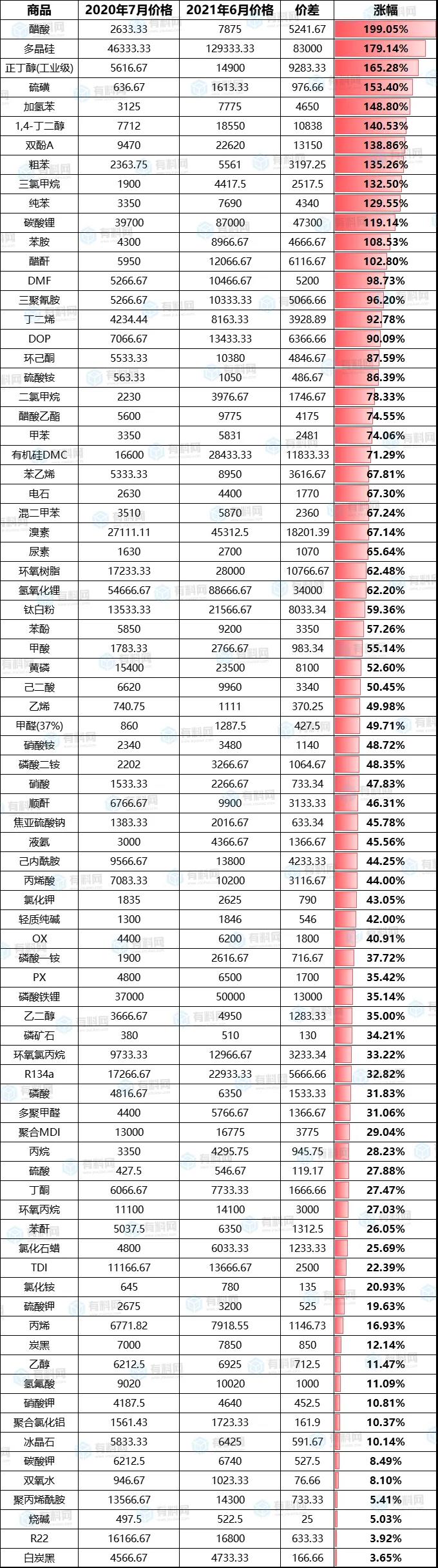 2020年下半年至今部分化工原材料價格變動表