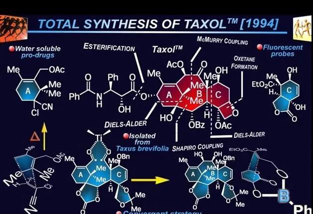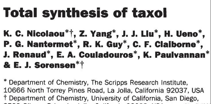 先后共有30多個研究組參與研究,化學(xué)家們投入大量人力和財力進(jìn)行了幾十萬次實驗,實屬罕見。而Nicolaou教授指導(dǎo)下紫杉醇合成的成功,在有機(jī)化學(xué)和抗腫瘤藥物研發(fā)領(lǐng)域意義非凡。1994年2月17日,Nature雜志首先報道了taxol的全合成。