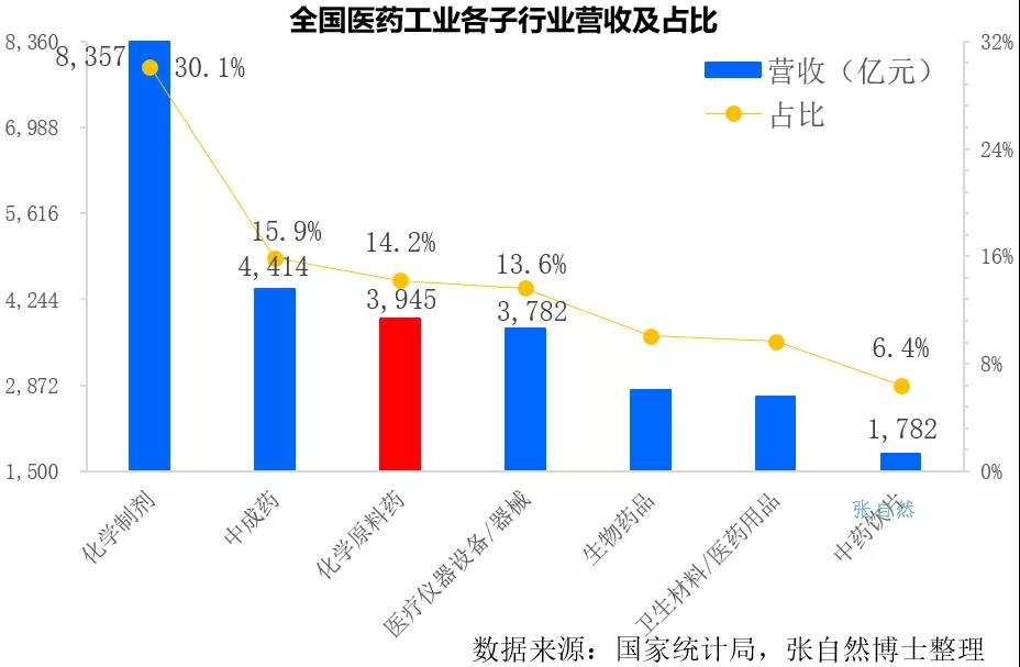 2020年,我國化學原料藥實現營收3945億元,占全國醫藥工業整體營收的14.2%,位居第三位,僅次于化學制劑和中成藥兩大支柱產業;同期,化學制劑和中成藥分別實現了8357億元和4414億元的營收,占比分別為30.1%和15.9%。