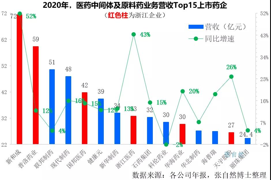 我國現有原料藥上市公司近40家,從原料藥上市公司的主營業務構成中摘取原料藥和中間體的營收進行排序,發現Top15藥企基本都保持了10%以上的增長速度,并穩居行業領先地位。Top15藥企中,浙江省占了6家(如圖4中的紅色柱所示),其中包括全國營收最大的企業新和成。2020年,新和成的原料藥和中間體銷售達71.52億元,其增速也最快,較其2019年47.08億元的營收增長了51.91%;普洛藥業規模第二,2020年其原料藥和中間體業務實現營收59.31億元,同比增長了12.03%;浙江醫藥增速位居第二位,2020年比上年同期增長了43.35%。此外,浙江省占了全球Top10原料藥生產商中的4席。目前,浙江臨海已建立國家級浙江省化學原料藥基地,也是全國化學原料藥和醫藥中間體產業開始最早和規模最大的集聚區。可以推斷,浙江在我國乃至全球化學原料藥行業將長期扮演重要角色。