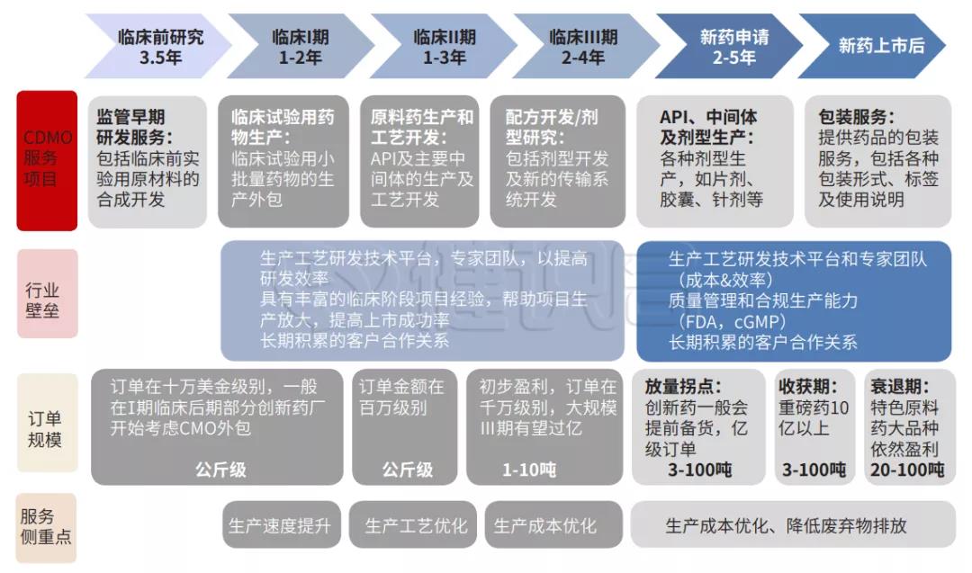 CDMO則最早由CMO而來(lái),承接研發(fā)的后端,為藥企提供生產(chǎn)服務(wù)。更進(jìn)一步,為藥企提供工藝開(kāi)發(fā)及制備、工藝優(yōu)化、商業(yè)化定制研發(fā)生產(chǎn)等服務(wù),成為更成熟的體系。