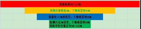 對(duì)于儲(chǔ)存期間含量逐漸下降的品種,中控含量限度除了要包容方法的誤差外,還要包容含量降低的幅度。假如成品的含量限度是90.0%-110.0%,含量在效期內(nèi)預(yù)期降低6%,檢測(cè)誤差不會(huì)超過(guò)2%,則中控限度應(yīng)定為98.0%-102.0%。